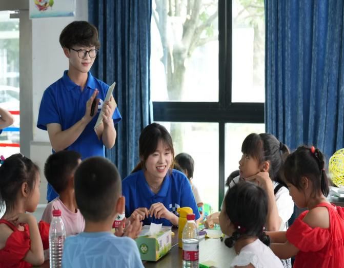 在开班仪式上,实践团10名成员依次自我介绍,孩子们以热烈掌声表达欢迎。实践团向家长与孩子们介绍本期课程安排。本期暑期课堂推行结对施教,采用分区特色教学模式,每位实践团成员分别与3-4名小朋友组成小队,根据不同年龄段孩子认知特点精准施教;同时分设“大老师”“小老师”,大老师承担课程教学,小老师细致指导。