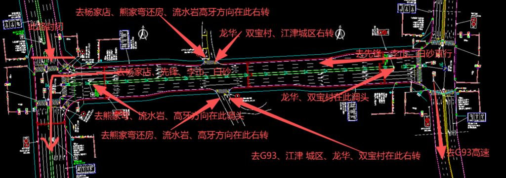 2、李市、白沙、先锋去江津城区、G93高速、龙华、双宝村方向的车辆在杨家店先锋方向路口汇入新建道路B段右转进入A段运行至香江大道;龙华、双宝村方向在A段与香江大道交叉处调头至原212 国道路口右出;