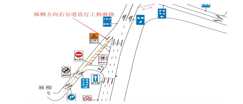 6、 由杨家店去麻柳方向自杨家店加油站前150米处向右变道直行至杨麻路口向右分道直行上杨麻路;