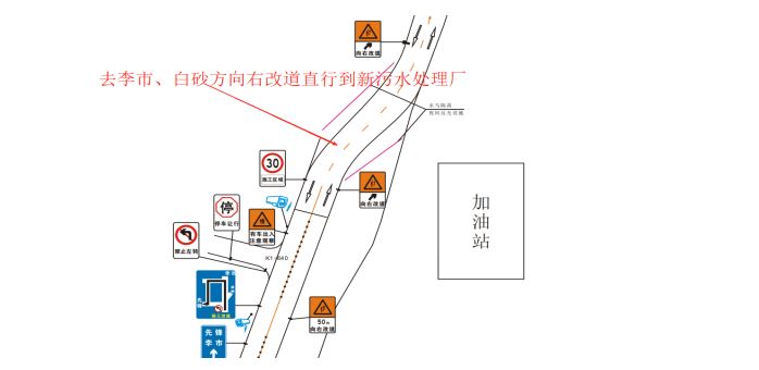4、 由杨家店去李市、白沙方向自杨家店加油站前150米处向右变道直行至新污水处理厂向左变道上渝合公路;